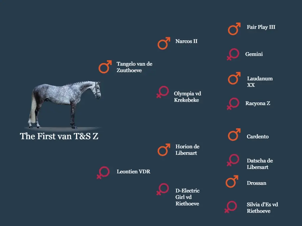 The First van T&S Z is a 5yo Zangersheide gelding who brings together elegance, scope, and a winning attitude. Sired by Tangelo van de Zuuthoeve, he has the looks and quality to stand out in any company.